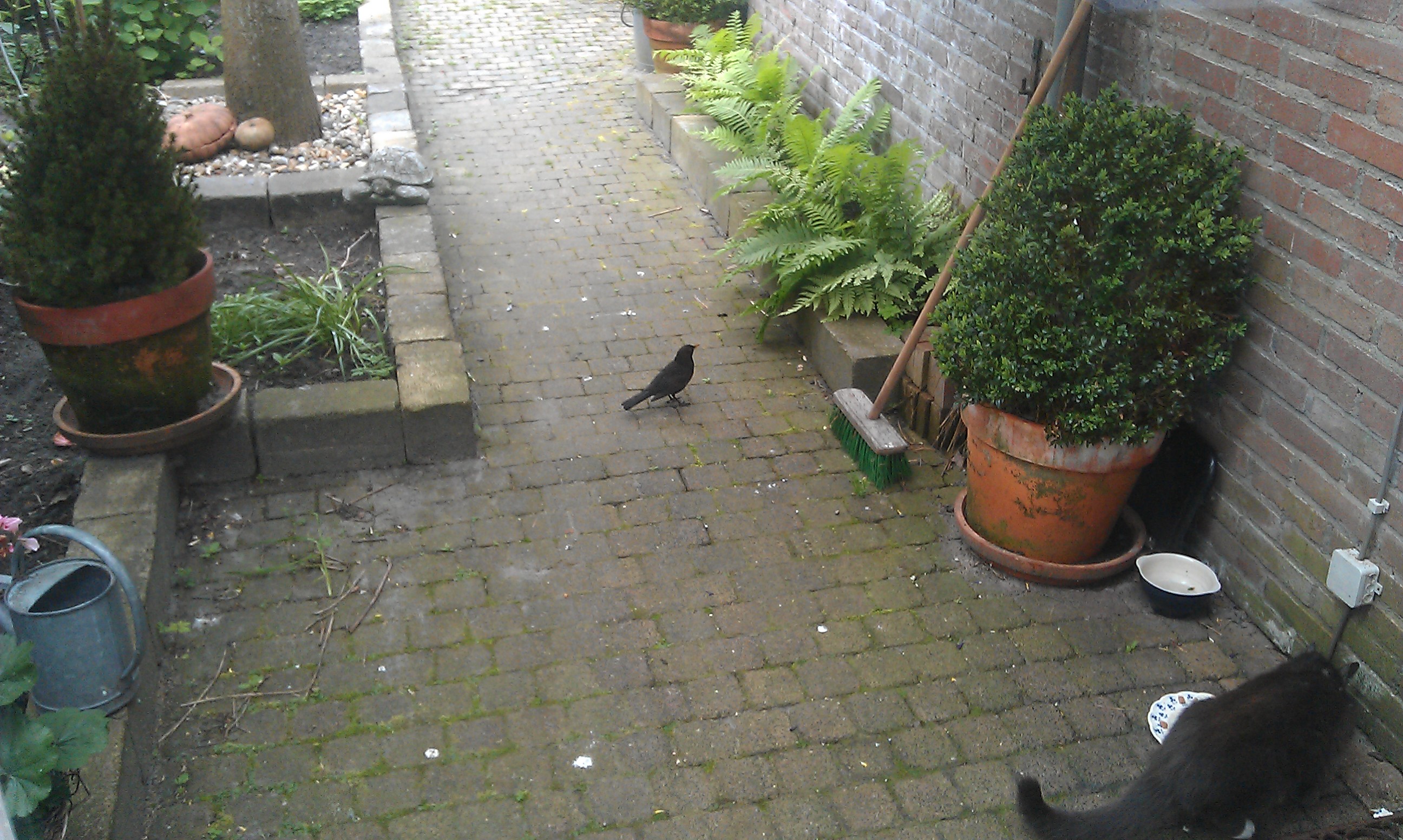 De merels weten dat de tandverliezende kater niet altijd zijn buiten geserveerde (omdat hij niet netjes boven zijn bordje kan eten) katteneten helemaal op eet. Zelfs als de kat nog op gepaste afstand uitbuikend zijn stinkende bekje wast, is Wouter er als de kippen bij om de restjes weg te werken. Ideaal hoor, nooit stinkende resten die achterblijven en…als dank hiervoor heeft hij mij beloofd in natura terug te betalen! Hij zit ook wel eens in de voortuin met zijn liefje Merel. Dan gaan ze als een malle tekeer onder de ligusterheg. Heftig zwiept hij dor blad weg met zijn gele snavel, op zoek naar vette wormen. Er moeten immers jonge merelbekjes gevuld worden.