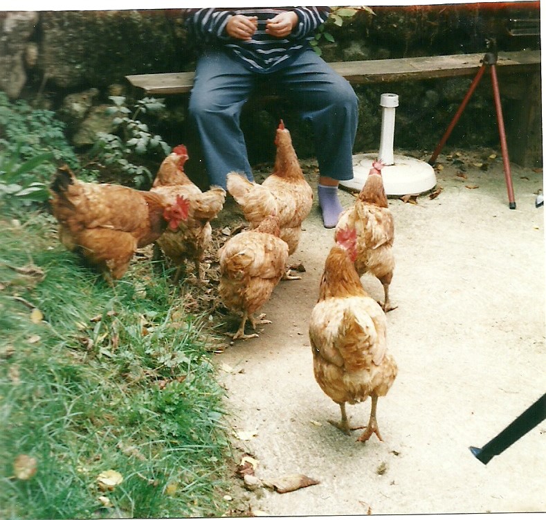 Niet alleen de kippen laten van zich horen. Regelmatig duiken er vrouwelijke familieleden van Debeaux op. Heel toevallig maken ze een zondags ommetje rond het buurtschap Mantel of zijn ze op zoek naar de zoon van Debeaux. Of wij weten waar hij is? Nee, dat weten we niet, maar het begin van een levendig gesprek is er en daar ging het waarschijnlijk om. Een waterval van vragen stort zich over ons uit. Waar komen we vandaan? Wat een schattige kinderen! Hebben jullie al kastanjes geraapt? Wat een droogte deze zomer! Hoe lang blijven jullie nog? Twee weken?