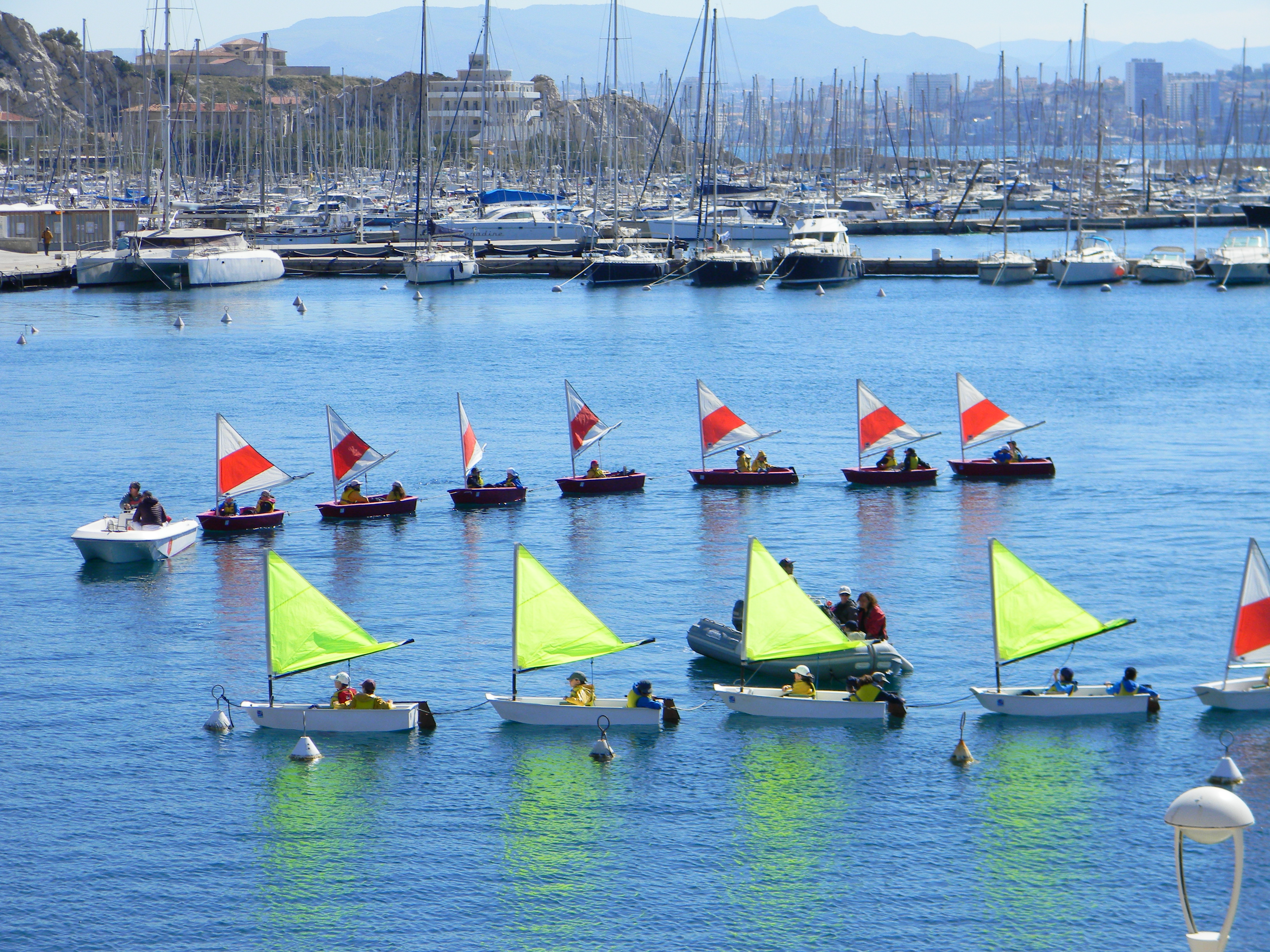 ⇒De strenge juffies en een enkele meester die de kleine Franse kindjes inwijden in de geheimen van het zeilen en een kleurrijk lint van Optimistjes vormen.
