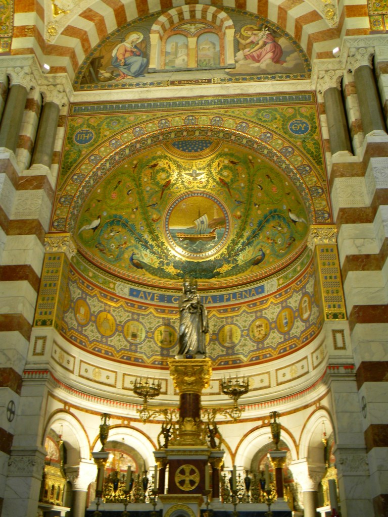 Als een goede moeder houdt de basiliek Notre Dame de la Garde toezicht op deze relatie en de bedreigingen van dit huwelijk, veilig op haar heuvel in Marseille. De gouden maagd op de toren blikkert in de zon. Ze doet haar bijnaam ‘la bonne mère’ eer aan en kijkt roerloos toe, zoals ze dat al eeuwen doet als beschermvrouw van de zeelieden. Ze heeft al vele stormen aan haar rokken voelen rukken, haar omvangrijke lijf vol in de wind. Ze wordt er niet heet of koud van: het waait hier wel vaker. Vanaf het balkon van ons vakantieverblijf, in de luwte en beschermd voor de mistral, zien we haar liggen. ’s Avonds, als het eiland een donkere jas aantrekt en duizenden lichtjes ontstoken worden op het vasteland, wordt zij extra in het zonnetje gezet en uitgelicht: voor haar is het elke dag moederdag. De Marseillais hebben ontzag voor haar, schenken haar ex-voto’s, investeren in marmeren plakkaten om hun onbescheiden wensen kracht bij te zetten en vragen haar om genezing en voorspoed.