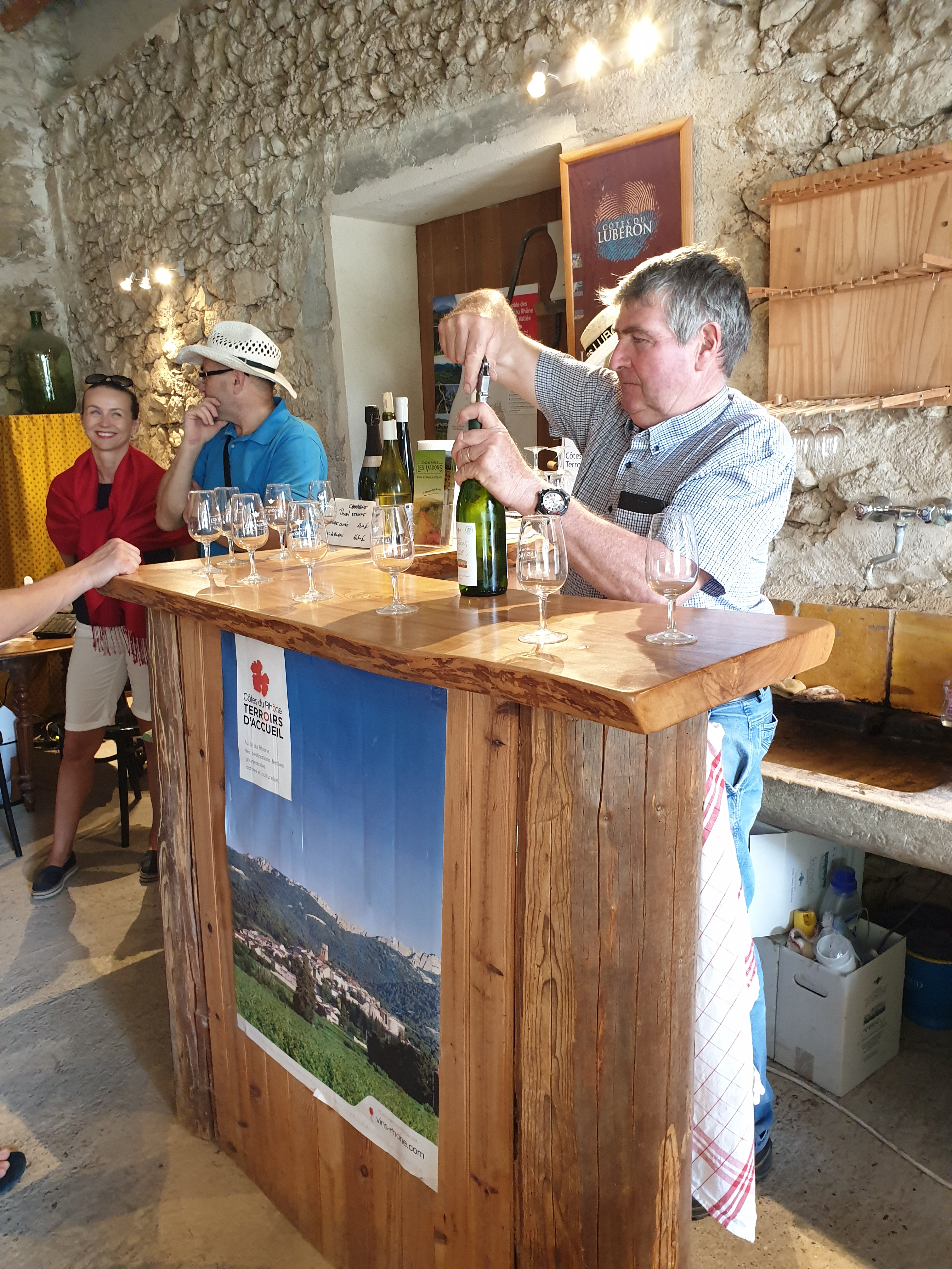 De aftrap is direct goed: de geur van witte bloemen en zacht wit fruit stijgt op uit het proefglas. Het doet denken aan de frisheid van een heldere bergbeek uit de Luberon, weliswaar met een zeer elegante smaak. Door de ligging van de wijngaarden op een hoogte van 200 – 450 meter zijn de temperatuurverschillen tussen dag en nacht groot en dat is de garantie voor frisse wijnen. Cépages: grenache blanc, roussanne, clairette, bourboulenc vermentino, ugni-blanc. Verrassend mooie wijn, en niet alleen omdat ik de wijnboer ken. De wijn is veel mooier dan de witte wijnen die wij in de afgelopen week dronken.