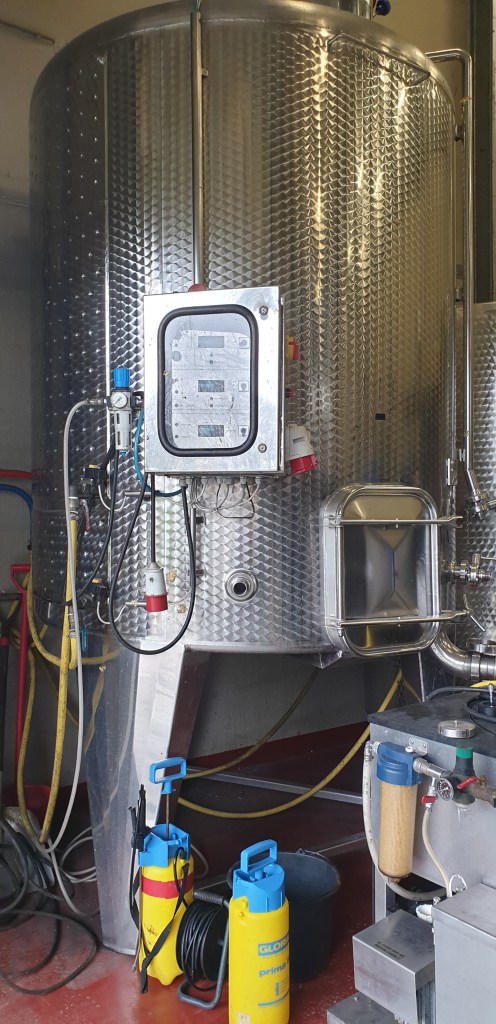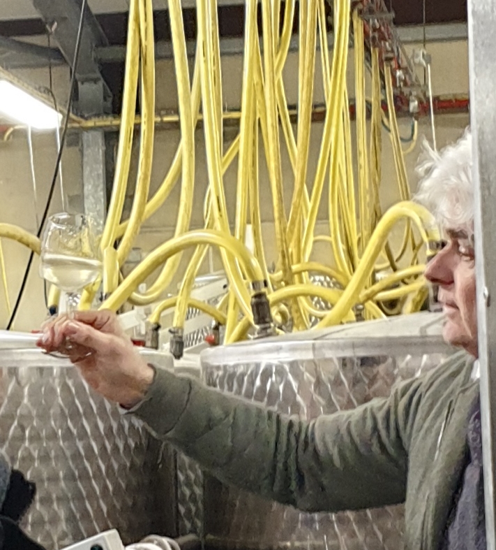 Het hele proces, de vinificatie van zowel wit, rosé als rode wijn, komt naar voren. De meeste witte wijn vergist in roestvrijstalen, temperatuur-gecontroleerde tanks. De wijn blijft zo lang als mogelijk sur lie, op de droesem: een laag van gisten. Een tamelijk ongrijpbaar begrip. Hoe ziet dat eruit? Roelof tapt een glas ‘droesem’ af (de zwaardere deeltjes gist zijn naar de bodem van de tank gezakt) en laat het glas rondgaan. Heel bijzonder om dit eens te ruiken.