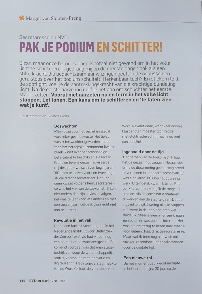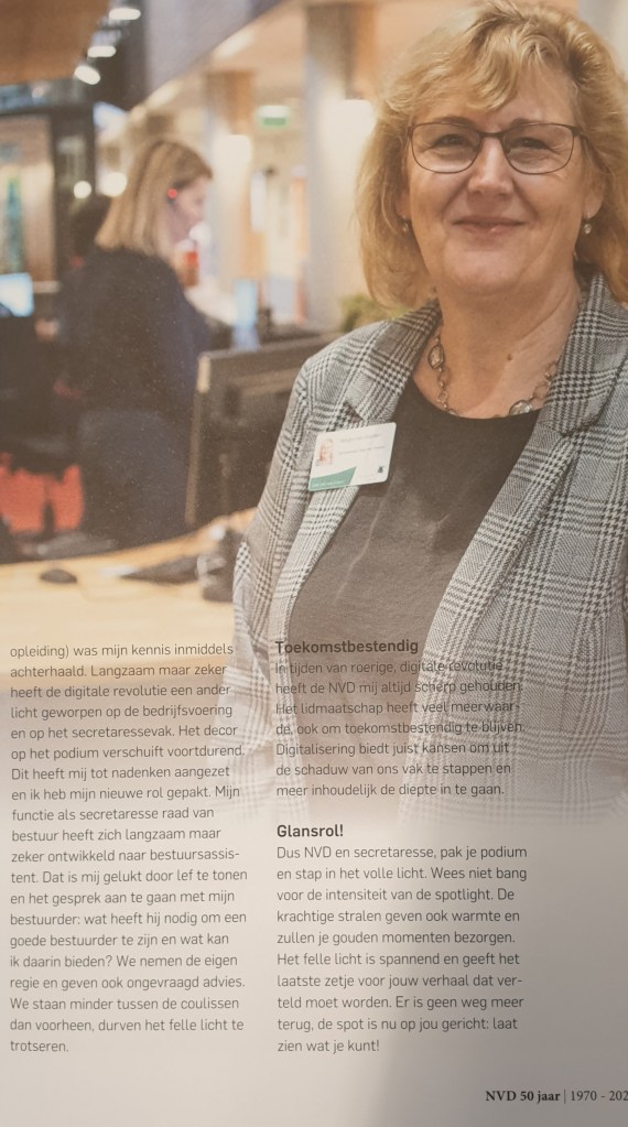 De Nederlandse Vereniging van Directie- en managementondersteuners bestaat 50 jaar. Al 50 jaar is de NVD het grootste netwerk voor directie- en managementondersteuners in Nederland. In een prachtig jubileummagazine blikken mijn vakzusters (en een enkele vakbroeder) terug, maar kijken vooral ook naar de toekomst, met als rode draad de vier kernwaarden: kwaliteit, kennis, kunde en kracht.