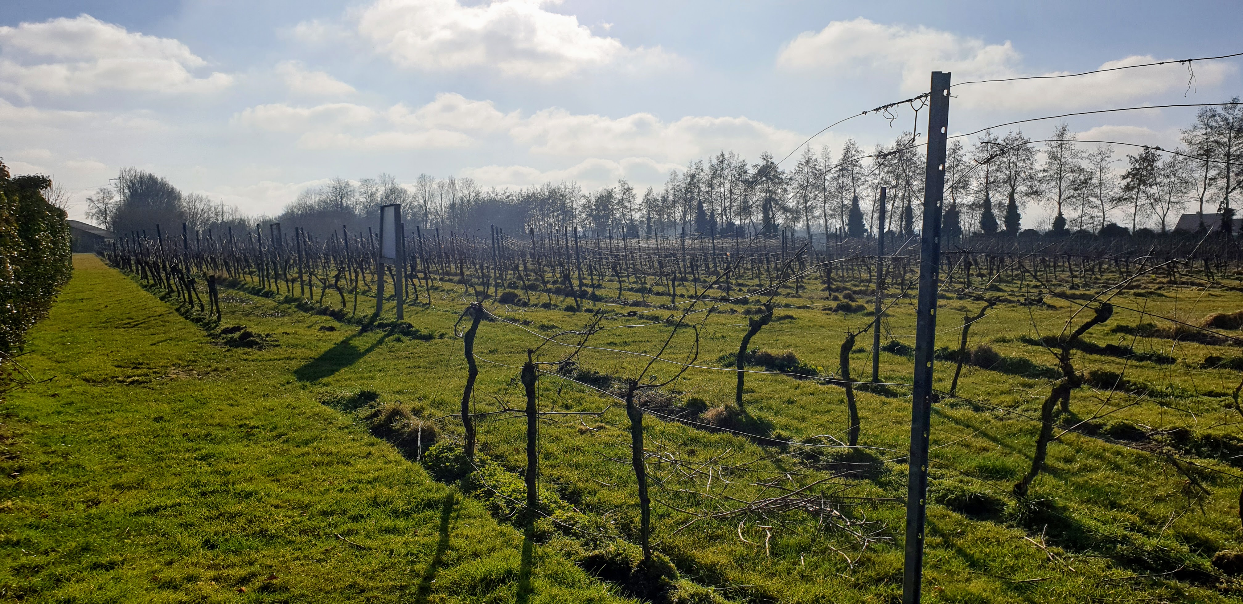 Het blijft bijzonder om vanuit de leegte van het vlakke akker- en weideland opeens in een wijngaard te staan. Die ook in de winter mooi blijkt te zijn. Het is de voorjaarszon die er het juiste licht op werpt en de innerlijke structuur in het volle licht zet: de schoonheid van kale wijnstokken. Bizar genoeg werd ik exact twee jaar geleden ook gegrepen door de schoonheid van kale wijnstokken (lees Piemonte: amore a prima vista). Toeval?