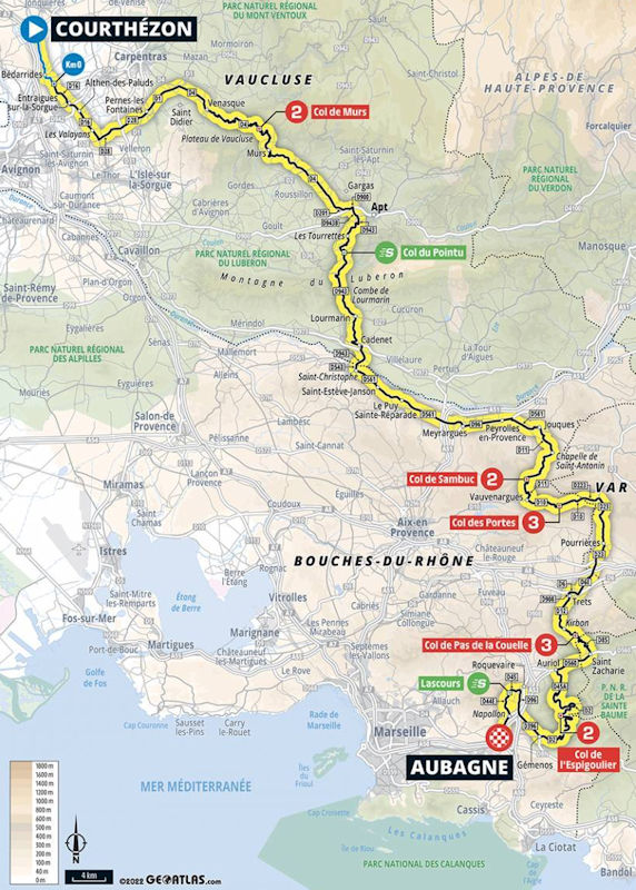 Etappe zes is een fijne etappe, de 214 kilometers van Courthézon naar Aubagne, dwars door het gebied waar ik zo graag kom, de Luberon. Ik verkneukelde mij bij voorbaat al op de beelden van Pernes-les-Fontaines, de Col de Murs, Apt, de Col du Pointu en uiteraard de passage door de belangrijkste doorgang in de Luberon, de Combe de Lourmarin. Wellicht zou de Franse regie ook wat fraaie helikopterbeelden van Bonnieux, Lacoste of Buoux laten zien, maar het imaginaire beeld van de doorkomst door Lourmarin en Cadenet deed mijn hart sneller slaan.