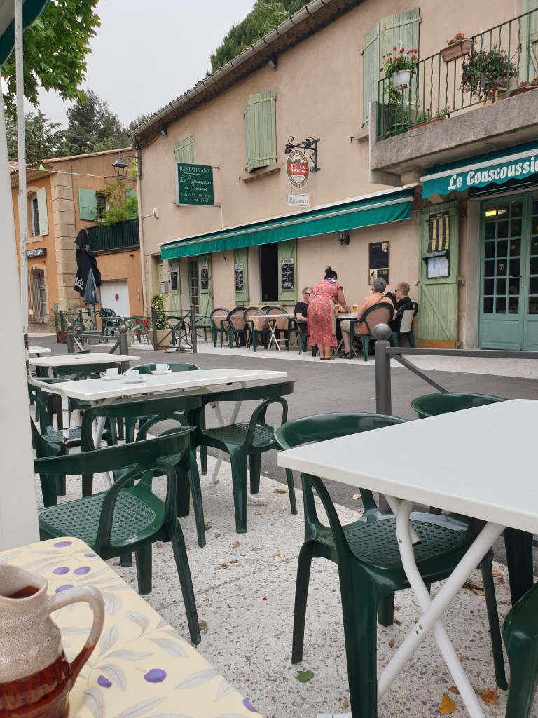 Ik zag het bijna voor me en hoopte vurig dat ze tenminste nog in Vauvenargues reden, een salade met een pichon rosé pakkend bij restaurant Le Couscoussier de Provence, met zicht op het Montagne Sainte Victoire en het Château de Vauvenargues, daar waar Picasso zijn laatste rustplaats vond. Helaas, de regie is onverbiddelijk en alle wielrenners trappen plichtsgetrouw stevig door. Ik val in de uitzending wanneer het peloton het Massif de la Sainte Baume aanvalt.