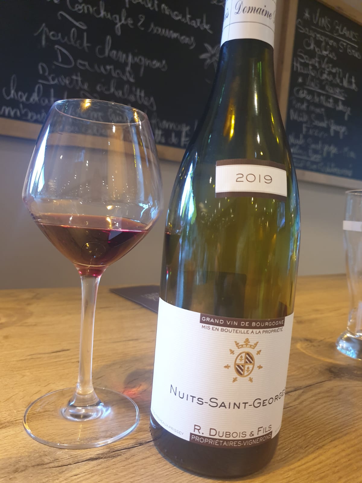 Kijk, dat is een opening, een hoopvolle mogelijkheid. Ik stel daarom voor om een aperitief te nemen, aan de hoge tafel met de barkrukken. Tijd hebben we, en wachten kunnen we heel goed, maar wel graag met een glas wijn erbij. Mijn charmeoffensief werkt. Met een fijn glas troostrijke Saint-Véran bestuderen we alvast het menubord achter onze tafel en maken preventief een keuze. En dat is maar goed ook, want opeens blijkt de twee uur wachten tot een kwartier teruggebracht te zijn. Zonder enige aarzeling bestel ik ook direct een puike fles wijn erbij, voor het geval dat het toch nog een tijd gaat duren. De jongste bediende – onervaren, maar met een ontwapenende glimlach – brengt razendsnel de Nuits-Saint-Georges 2019 van R. Dubois & Fils, een producent uit Prémeaux-Prissey, die wijngaarden het ‘om de hoek’ van het hotelrestaurant.