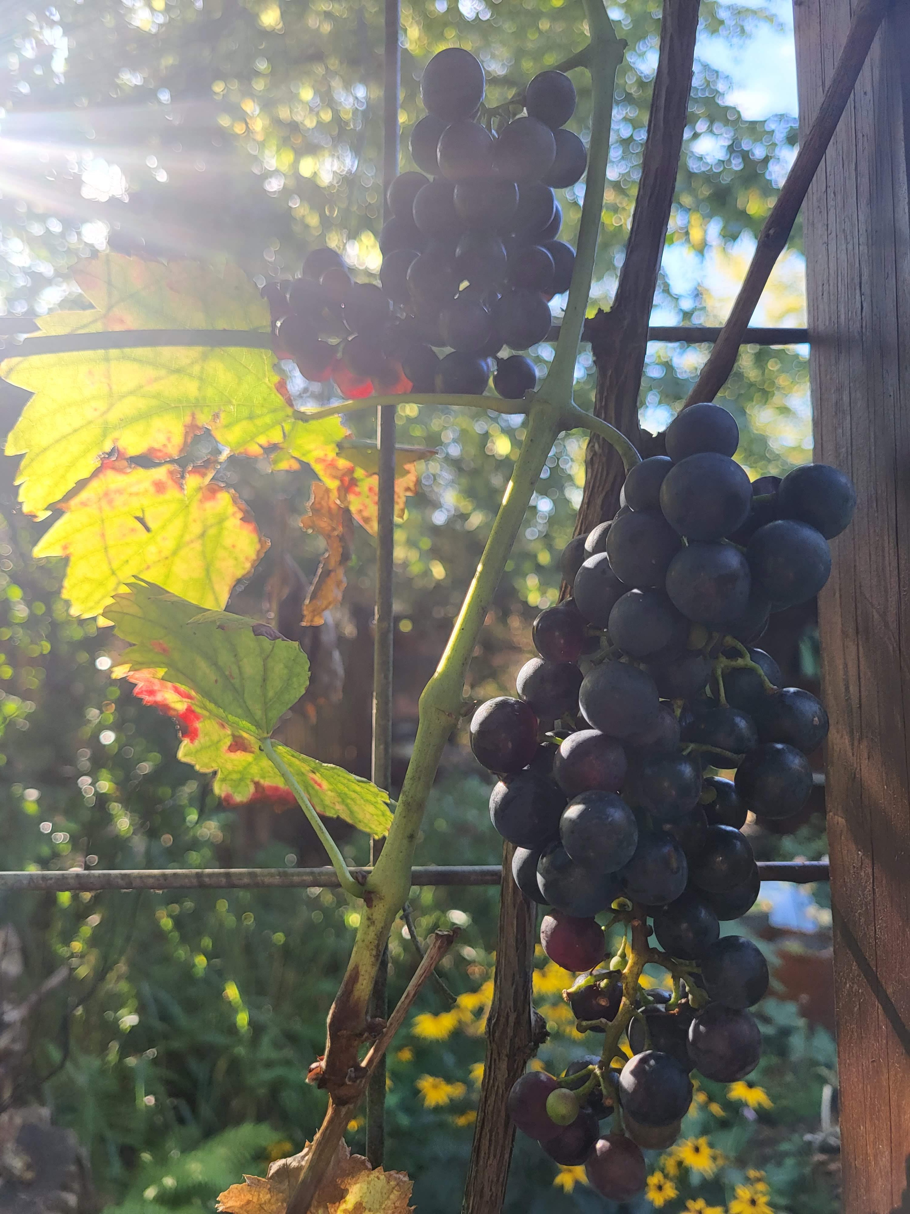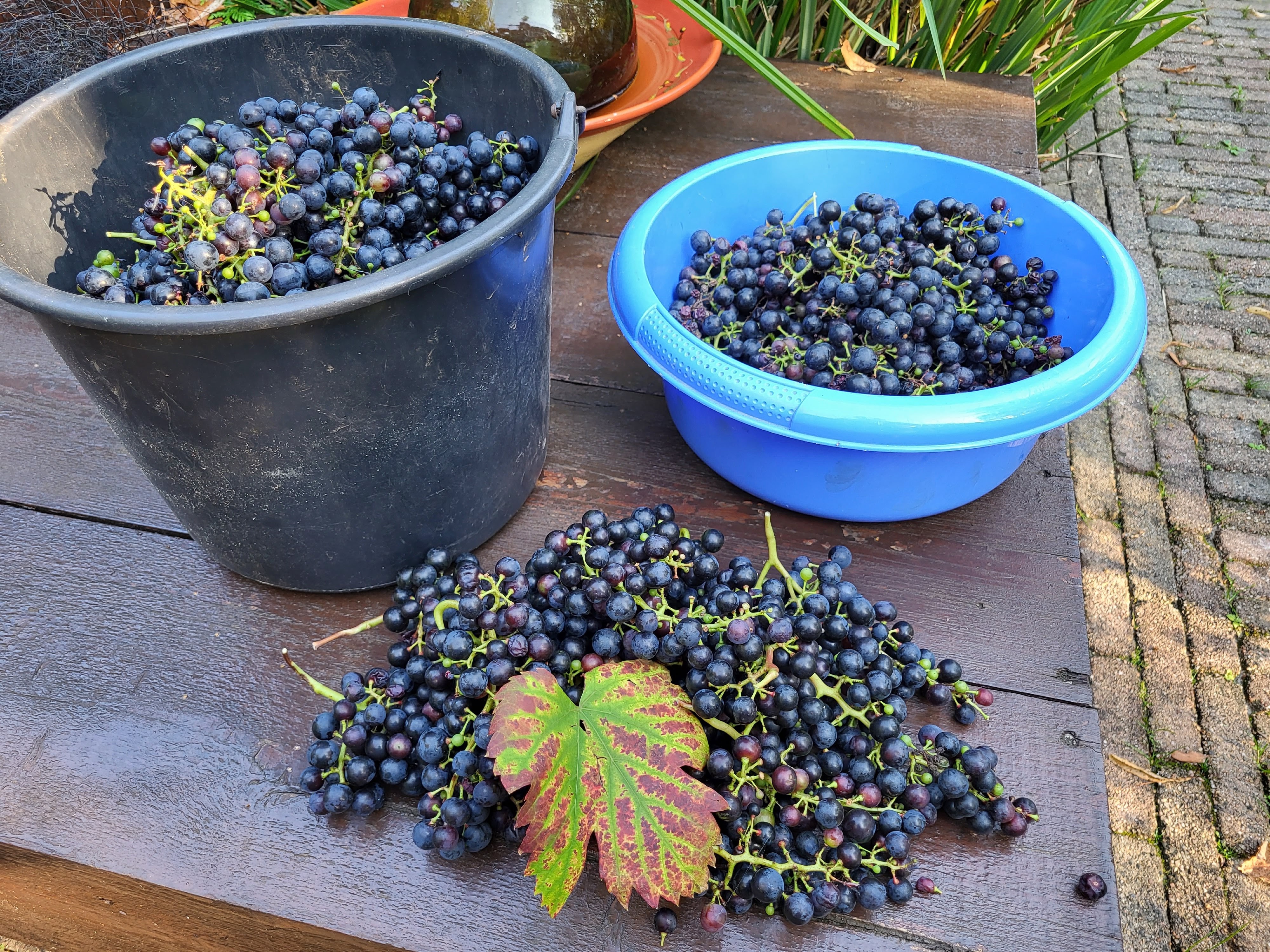 Het oogstjaar 2023 was hoopvol. De vier stokken op de pergola hingen bomvol, drie (twee jaar oude) stokken beneden zijn nog vruchtloos, nummer vier is wel prachtig beladen. De overvloedige regenval in de zomer heeft gelukkig weinig schade aangericht: geen spoortje meeldauw. Lang leve de nieuwe – vochtresistente – druivenrassen die wijnbouw in Nederland mogelijk maken. Bovendien waren er geen akelige hagelbuien en was er best nog leuk zon de laatste weken. Mijn druiven waren grotendeels rijp. Een klein deel zou nog wat zonuren kunnen meepakken. De laatste weken voelde ik mee met elke wijnboer waar ook ter wereld. Je prijst jezelf gelukkig dat er in ieder geval druiven hangen. Vorig jaar was mijn opbrengst nul. De zetting totaal mislukt.