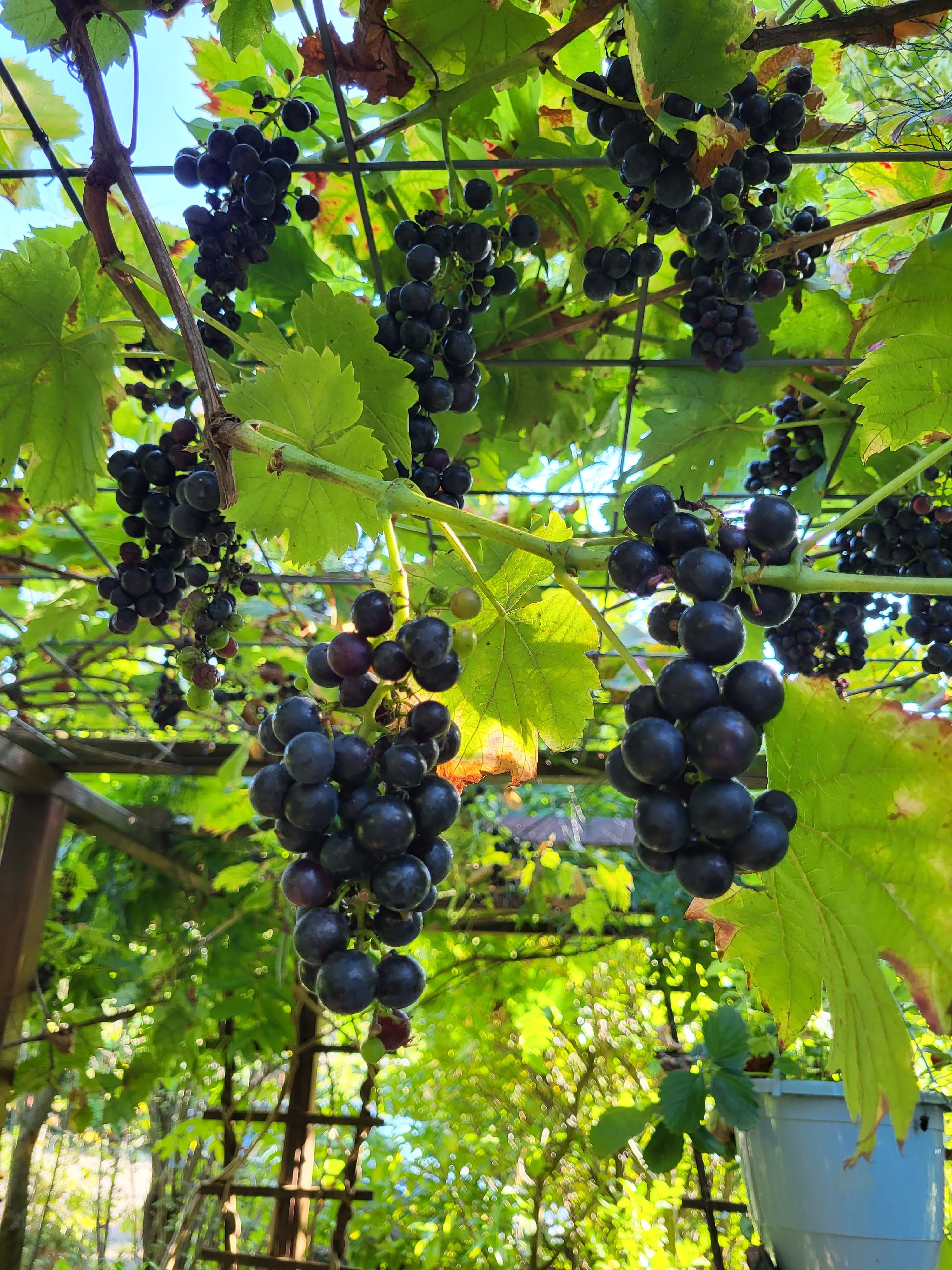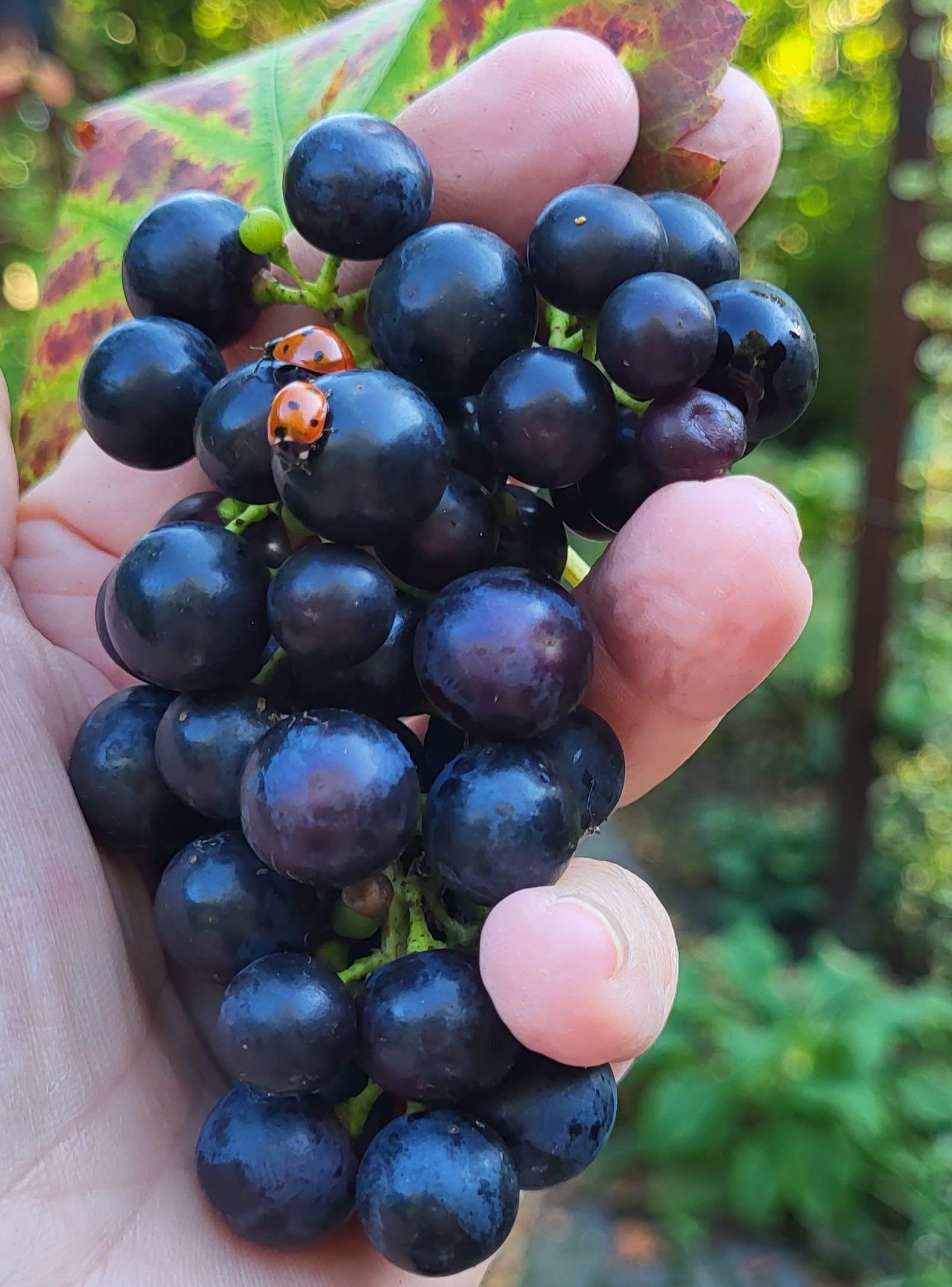 In goed overleg met merel, lieveheersbeestjes en wespen, als belanghebbenden in mijn wijngaard, viel het besluit om het oogstmoment niet langer uit te stellen. Nog langer wachten was geen optie. Zo hier en daar waren zichtbare sporen van wespenvraat, vielen trossen spontaan naar beneden en droogden de bessen in. Nog niet alles was fenolisch rijp (ik ging daarbij uit van de kleur van de pitten van de bessen), maar voor het maken van gelei geen enkel probleem. Dus oogste ik op 14 september 2023 ’s avonds mijn regentdruiven (een half uurtje werk voor 5 kilogram ontsteelde en geselecteerde druiven). Merel. twee lieveheersbeestjes en een verdwaalde wespenvriend waren erbij en zagen dat het goed was. Met een minzaam knikje nam Merel genoegen met de paar trosjes die ik als coulance had laten hangen. Ik heb haar plechtig moeten beloven dat ik de komende winter voor aanvullende lekkernijen zal zorgen.