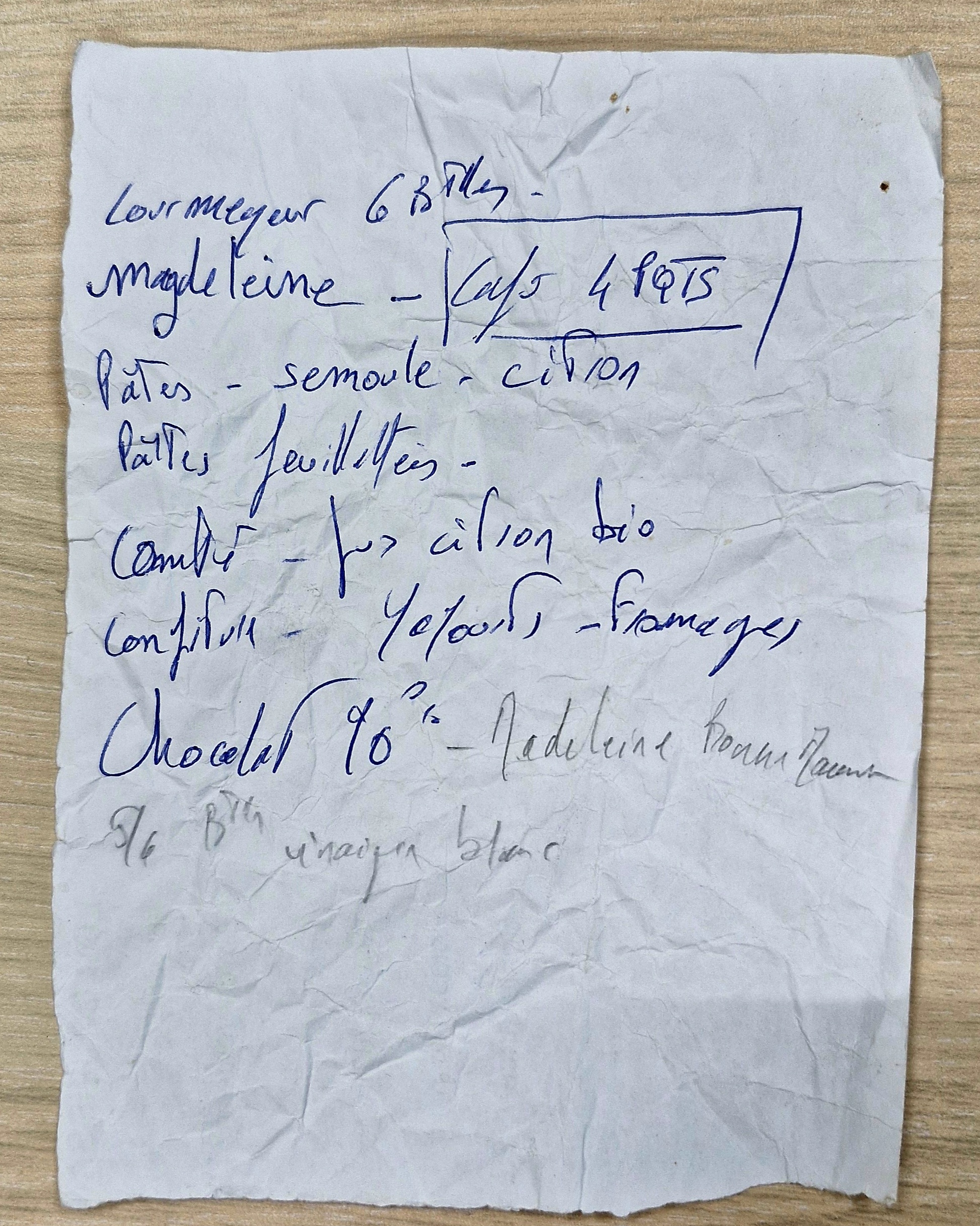 Zonder enig maandagochtendgevoel ontgrendel ik een boodschappenkar bij de Super U in Ganges. Onmiddellijk valt me op dat er een propje papier is achtergelaten in de linkerhoek van het stalen winkelros. Klaar, weg ermee, moet de boodschapper hebben gedacht. Het kan natuurlijk een niemendalletje zijn, maar ik kan niets anders dan het openvouwen en gladstrijken. Twee woorden vallen direct op: Magdeleine (met pen geschreven) en Madeleine Bonne Maman (in dun potlood). En dan die mysterieuze achterkant van het briefje!